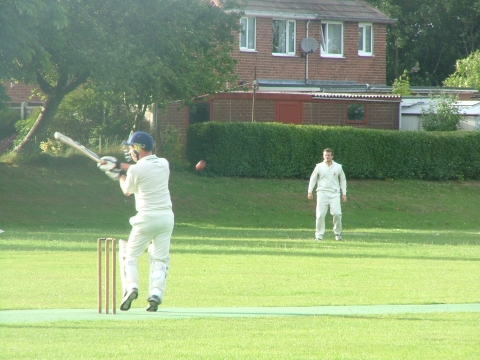 Kerpow ! Looks like James has been at the Bob Martins this week as he hits a mighty six right out of the ground. Luckily it bounces on the roof of a house and is returned to play ! Another cracking knock from James as he retires on 25 after a mere 4 overs. |